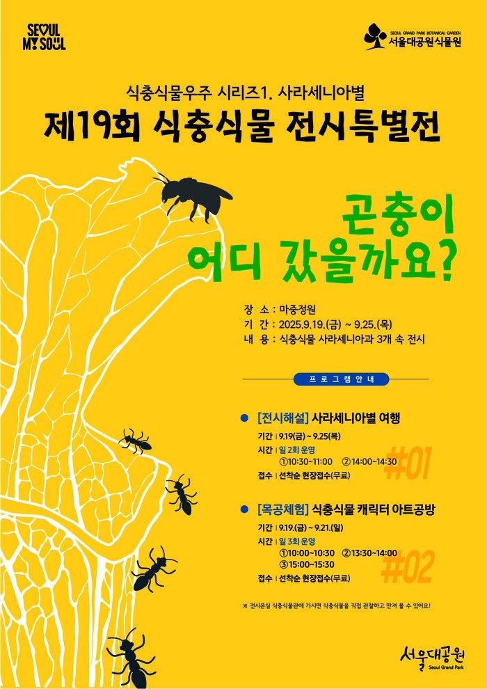 서울대공원 식물원이 오는 19일부터 25일까지 7일간 동·식물원 내 마중정원에서 제19회 식충식물 특별전 ‘식충식물 우주시리즈1 – 사라세니아별’을 개최한다. 서울대공원은 2018년부터 산림청 국립수목원 위탁사업을 통해 총 463종 7,149본의 식충식물을 확보해 국내 최대 규모의 자원을 보유하고 있다.