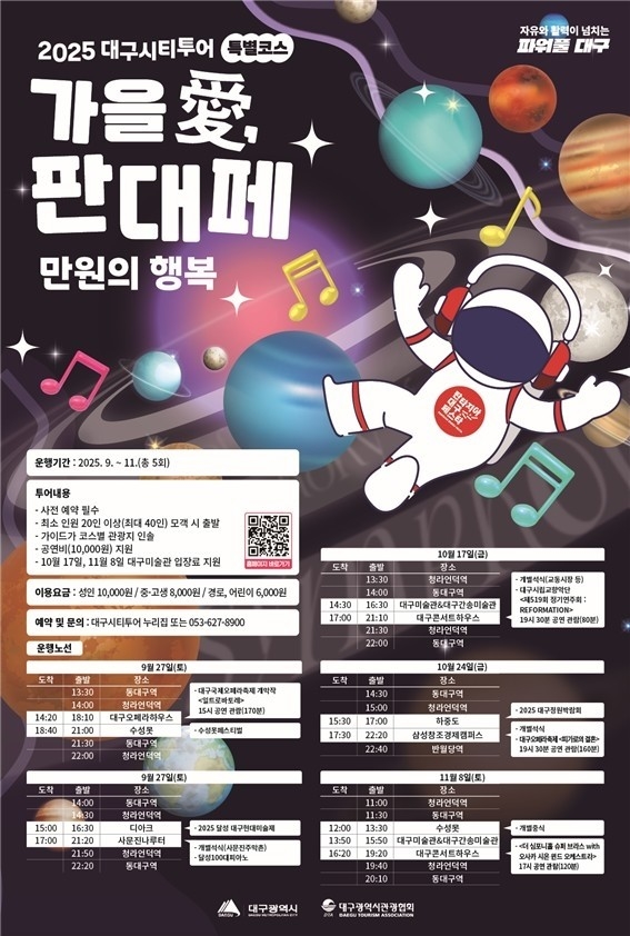 이재성 대구시 문화체육관광국장은 “여행하기 좋은 가을철에 평소 접하기 어려운 다양한 공연을 함께 즐길 수 있는 기회”라며 “앞으로도 계절과 테마에 맞춘 시티투어 특별노선을 지속 발굴해 지역관광 활성화에 기여하겠다”고 말했다.
