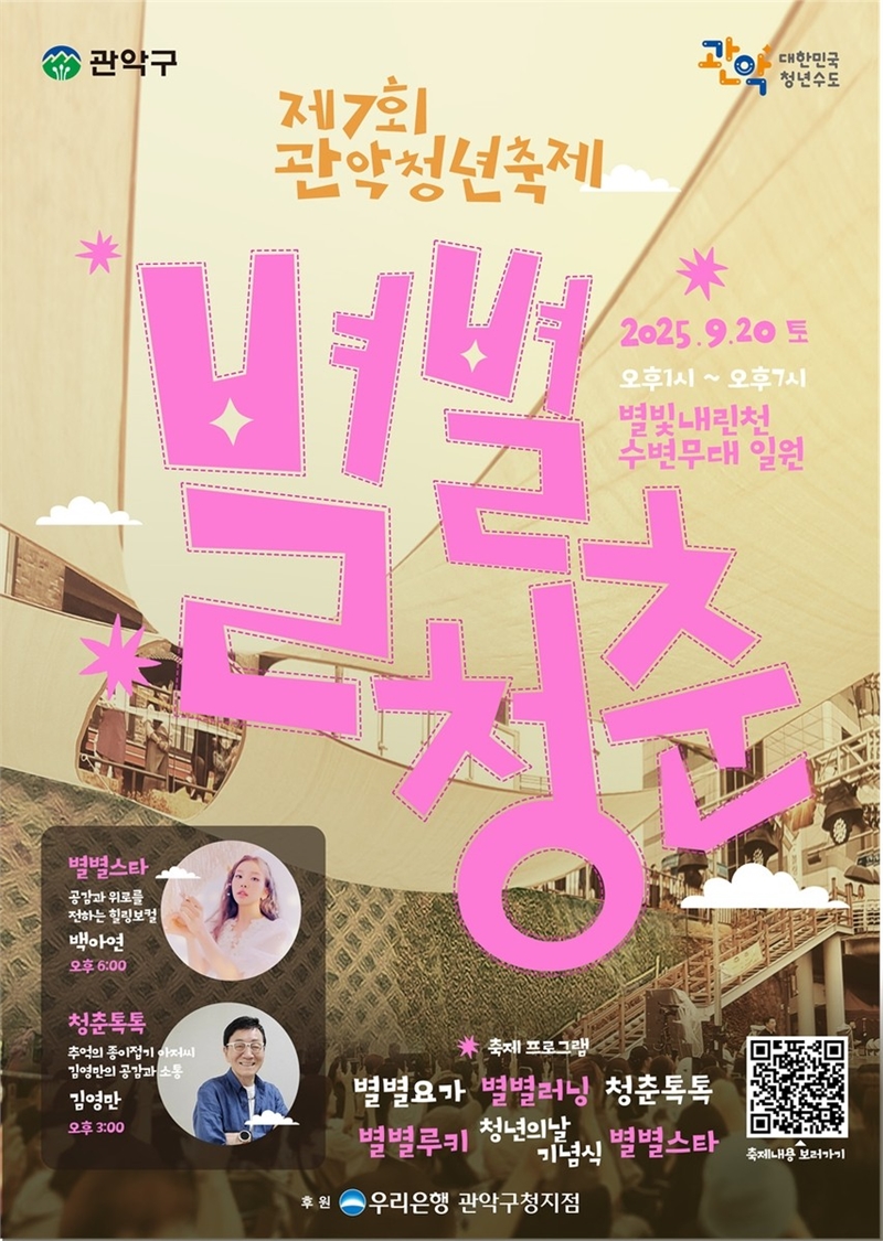 관악구(구청장 박준희)가 오는 9월 20일 오후 1시부터 7시까지 신림역 별빛내린천 일대에서 제7회 관악청년축제 ‘별별청춘’을 개최한다. 이번 행사는 청년의 날을 기념하고 청년들의 가능성을 응원하며 문화와 경험을 공유하는 장으로 마련됐다.
