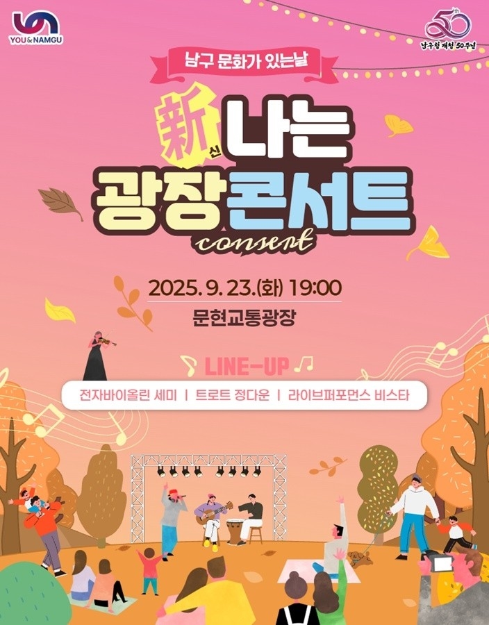 부산 남구(구청장 오은택)는 오는 9월 23일 남구 문현교통광장에서 2025 남구 문화가 있는 날 행사인 ‘新나는 광장콘서트’를 개최한다고 밝혔다.