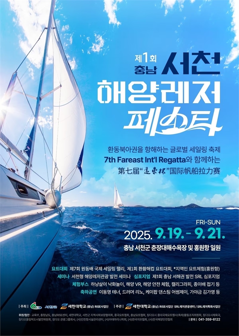 충남 서천군은 오는 9월 19일부터 21일까지 춘장대해수욕장과 홍원항 일원에서 ‘제1회 서천 해양레저페스타’를 개최한다. 이번 행사는 세한대학교 충남RISE사업단이 주최하며, ‘서천군 하이퍼 로컬 해양레저관광 중심지 육성’ 사업의 일환으로 추진된다.