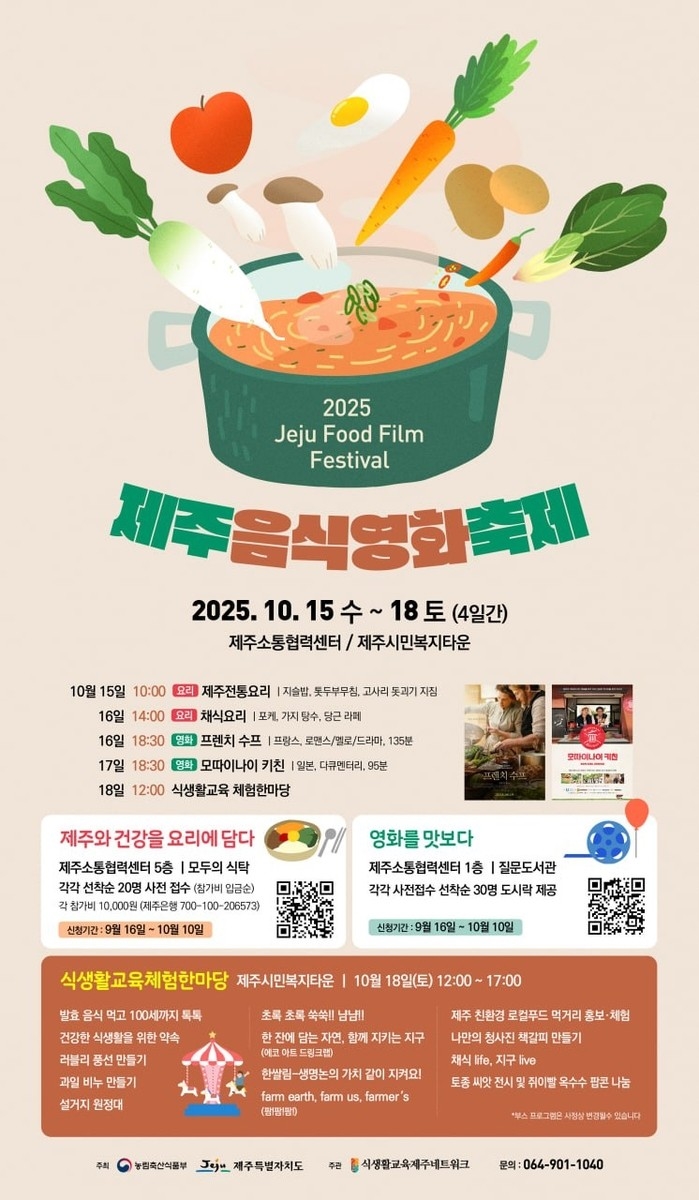 사단법인 식생활교육제주네트워크는 오는 10월 15일부터 18일까지 ‘2025 제주 음식 영화축제’를 개최한다고 밝혔다. 이번 축제는 영화 상영과 요리 교실, 체험 한마당을 결합해 음식과 문화를 함께 즐길 수 있도록 기획됐다.