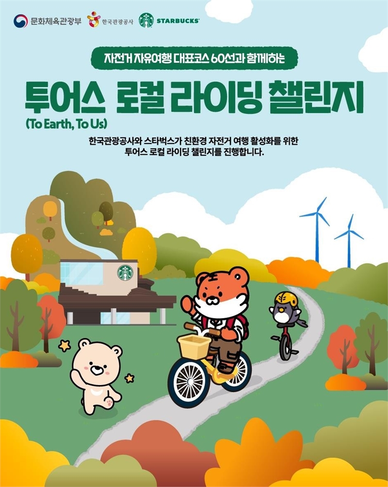 한국관광공사와 스타벅스가 친환경 자전거 여행 캠페인 ‘투어스(To Earth, To Us) 로컬 라이딩 챌린지’를 진행한다고 밝혔다. 이번 캠페인은 오는 26일부터 다음 달 25일까지 한 달간 이어지며, 자전거 여행 활성화와 친환경 여행 문화 확산을 목표로 마련됐다.