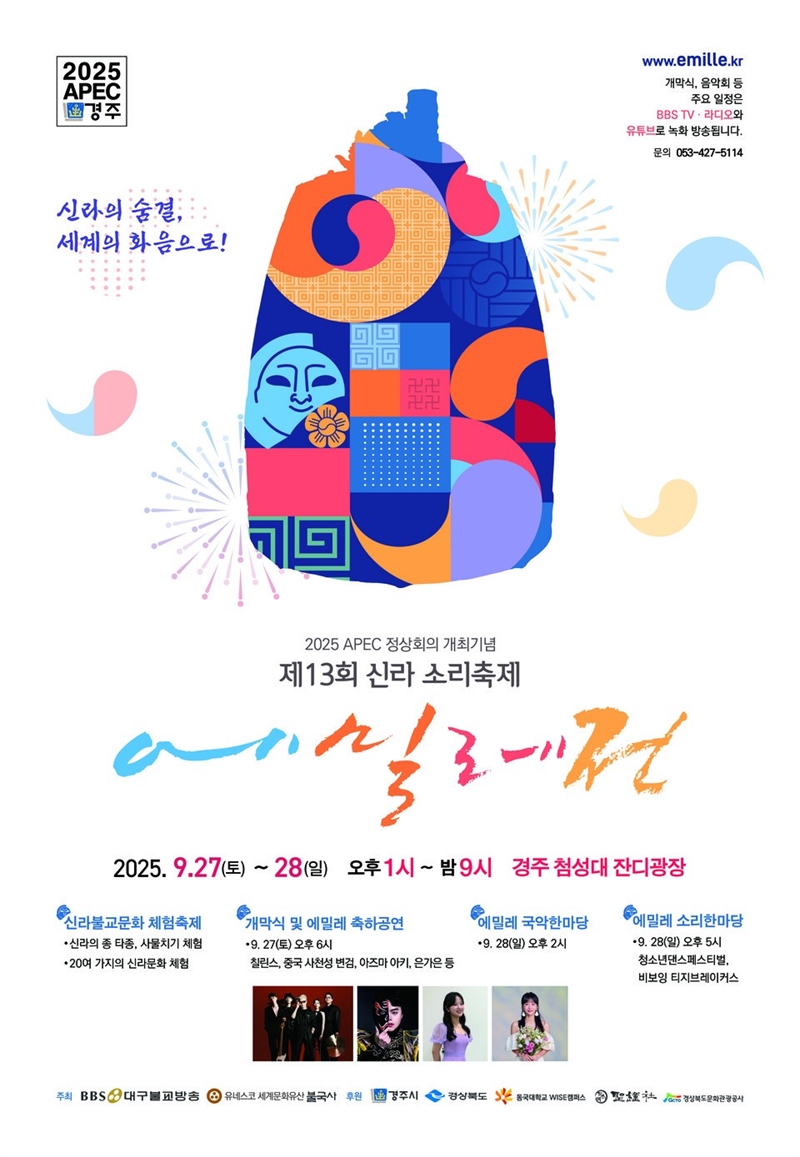 매년 가을 열리는 경주의 대표 문화축제인 에밀레전은 신라 천년의 울림을 현대적으로 되살려 국내외 관광객과 시민들에게 선보여 왔다. 올해는 ‘신라의 숨결, 세계의 화음으로!’를 주제로 전통과 현대가 어우러진 공연과 체험 프로그램을 통해 경주의 역사적 가치를 재조명하는 동시에, 2025 APEC 정상회의 성공 개최 염원을 전하는 글로벌 문화축제로 꾸며진다.