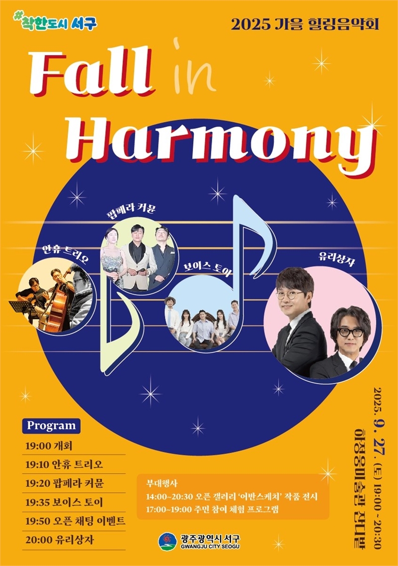 광주광역시 서구(구청장 김이강)는 오는 27일 오후 7시 농성동 하정웅미술관 앞 잔디광장에서 ‘2025 가을 힐링음악회 - 폴 인 하모니(Fall in Harmony)’를 개최한다고 밝혔다.