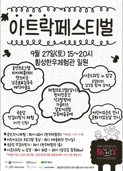 강원 횡성문화관광재단은 오는 27일 오후 3시부터 8시까지 횡성한우체험관 일원에서 ‘2025 문화가 있는 날-아트락페스티벌’을 개최한다고 밝혔다.