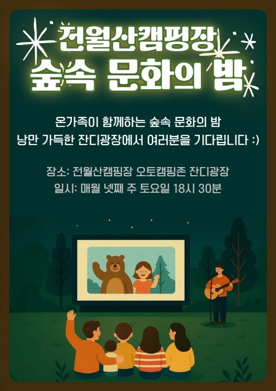‘숲속 문화의 밤’은 매월 넷째 주 토요일 전월산캠핑장 잔디광장에서 열리며, 캠핑장 이용객이라면 누구나 참여할 수 있다. 특히 9월 첫 회차에는 지역 예술인들의 공연이 마련돼 가을밤을 특별한 추억으로 채워줄 예정이다.