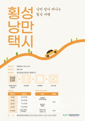 횡성 낭만택시는 사전 예약제로 운영되며, 예약 및 요금 안내는 횡성문화관광재단 홈페이지에서 확인할 수 있다.