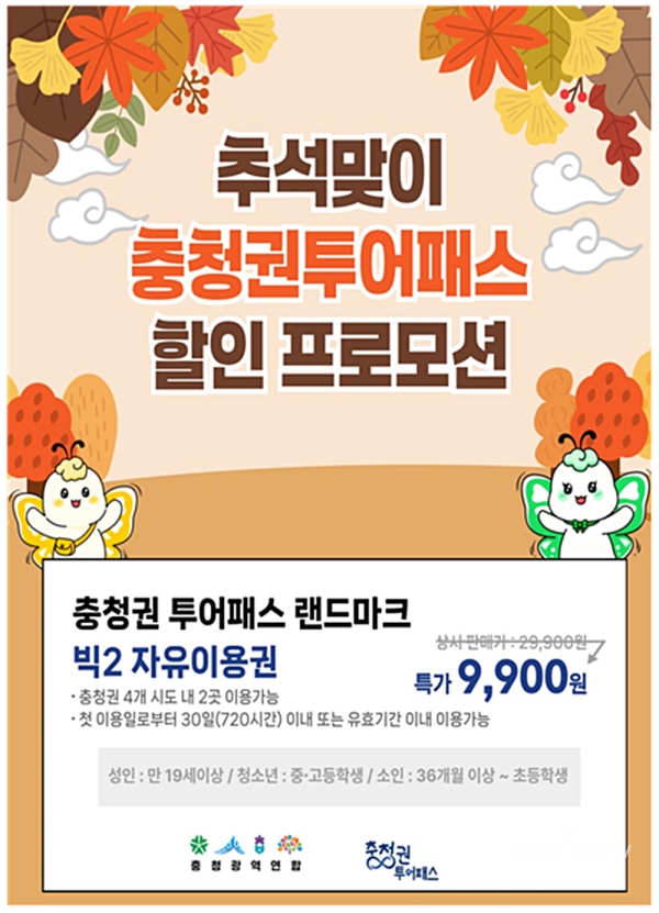 충청광역연합은 추석 명절을 맞아 충청권 대표 관광상품인 ‘충청권투어패스’의 특별 할인 프로모션을 마련했다고 밝혔다. 이번 이벤트는 가족 단위 여행객들이 충청권 관광지를 합리적인 가격으로 즐길 수 있도록 기획됐다.
