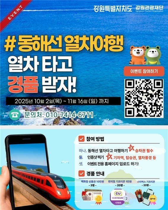 강원특별자치도와 강원관광재단은 추석 연휴와 가을철 성수기를 맞아 오는 11월 16일까지 ‘KTX 동해선 철도여행 인증 이벤트’를 진행한다고 밝혔다. 이번 행사는 동해선 철도여행의 매력을 알리고 철도 정거장을 연계한 동해안 관광 활성화를 목적으로 마련됐다.