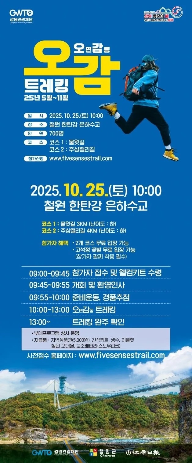 강원관광재단 관계자는 “이번 ‘오감트레킹’은 자연을 오감으로 느끼며 철원의 대표 관광지를 직접 걸어볼 수 있는 행사로, 지역 경제 활성화와 걷기 여행 문화 확산에 기여할 것으로 기대된다”고 밝혔다.