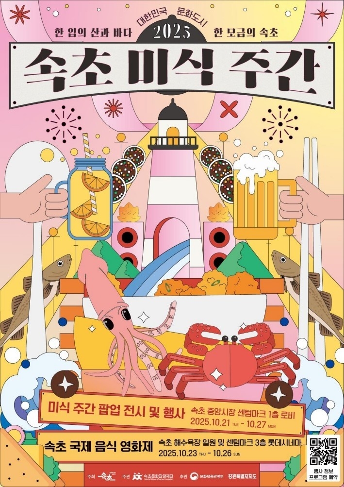 같은 기간 열리는 ‘2025 속초 미식 주간’은 ‘맛으로 잇고, 도시를 깨우다(EAT, CONNECT, RE:VIVE SOKCHO)’를 주제로 음식·관광·예술이 융합된 미식 도시 프로젝트로 운영된다. 속초 해수욕장과 중앙시장 센텀 마크 일대에서 글로벌 미식 포럼, 속초 국제 음식영화제(SIFFF), 미식투어, 미식로드, 시너지위크, 미식 다이닝 등 다양한 프로그램이 펼쳐진다.