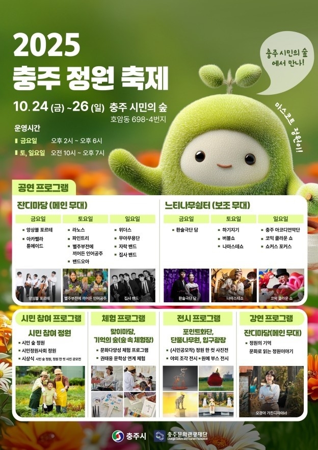 충주문화관광재단 관계자는 “이번 축제는 충주의 정원문화를 알리는 상징적인 출발점이 될 것”이라며 “시민이 주체가 돼 자연과 함께 살아 숨 쉬는 정원도시 충주의 비전을 널리 알리는 계기가 되길 바란다”고 말했다.