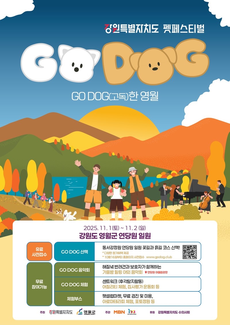 강원도와 영월군이 주최하고 MBN이 주관하는 반려견 체험형 축제 ‘고독(GO DOG)한 영월’ 펫 페스티벌이 다음 달 1일부터 2일까지 이틀간 영월군 동서강 연당원 일원에서 열린다.