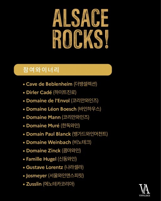 행사는 업계 관계자 대상의 1부와 일반 소비자 대상의 2부로 나뉘어 진행된다. 일반 소비자 시음회는 참가비 1만원으로, ‘Alsace Rocks’ 로고가 새겨진 와인잔이 제공되며 다채로운 알자스 와인을 자유롭게 시음할 수 있다.
