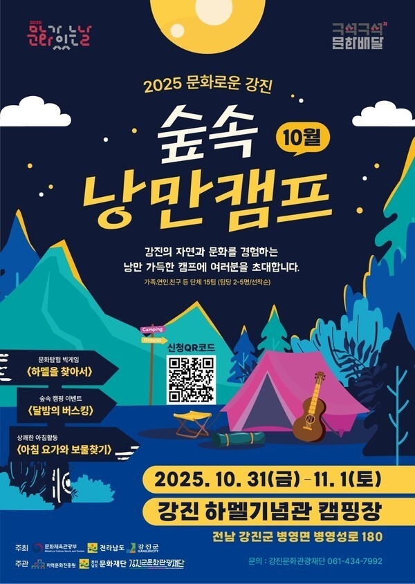 강진군과 강진군문화관광재단은 ‘캠핑과 함께하는 문화로운 강진’ 2차 행사를 오는 31일부터 11월 1일까지 병영면 하멜 감성텐트촌에서 개최한다고 밝혔다. 이번 행사는 문화체육관광부가 주최하고 지역문화진흥원이 주관하며, 가족·연인·친구 단위 참가자를 대상으로 강진의 자연과 문화, 역사를 체험할 수 있는 1박 2일 힐링 문화캠프다.