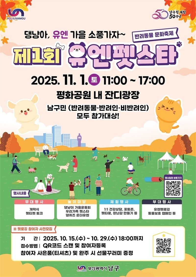부산광역시 남구(구청장 오은택)는 11월 1일 평화공원 내 잔디광장에서 구 개청 50주년을 기념하는 ‘제1회 유엔펫스타(Pet Star)’ 반려동물 문화축제를 개최한다고 밝혔다. 이번 행사는 반려인과 비반려인 모두가 함께 어울리며 올바른 반려동물 문화를 배우고 체험하는 시민 참여형 축제로 마련됐다.
