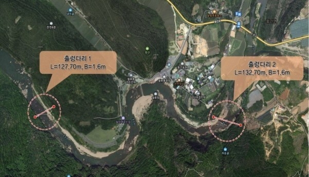 충북 영동군은 황강면 원촌리 월류봉 일대에 탐방객 안전을 강화하기 위한 2개의 출렁다리(안전보행교)를 설치한다고 밝혔다. 군은 도비 등 60억 4천만 원을 투입해 기존 징검다리 두 곳을 대체할 ‘출렁다리 1’(길이 127.7m·폭 1.6m)과 ‘출렁다리 2’(길이 132.7m·폭 1.6m)를 내년까지 조성할 계획이다.