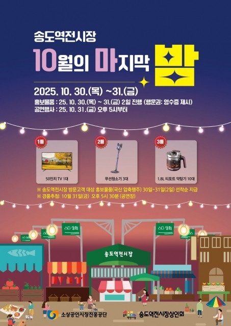 송도역전시장이 고객 감사의 마음을 담아 공연과 경품 이벤트가 어우러진 ‘10월의 마지막 밤 축제’를 오는 10월 30일부터 31일까지 이틀간 개최한다. 이번 행사는 송도역전시장 상인회가 주최하고 소상공인시장진흥공단의 예산지원사업으로 추진된다.