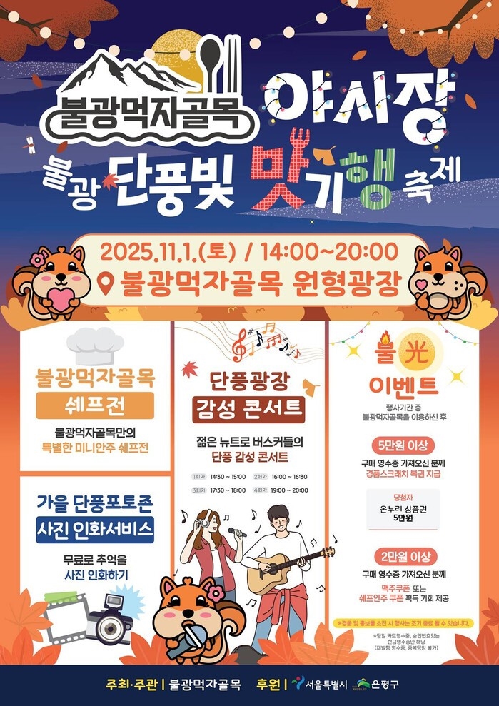 오후 2시부터 8시까지는 불광먹자골목 내 10여 개 상점이 참여하는 ‘가을 야시장 셰프전’이 열린다. 상점별 대표 메뉴를 활용한 무료 시식 행사와 특가 판매 부스가 운영되며, 방문객을 위한 단풍 포토존과 즉석 사진 인화 서비스도 마련된다. 이어 오후 2시 30분부터는 ‘뉴트로 감성 버스킹 공연’이 진행돼 가을 야시장의 낭만적인 분위기를 더한다.