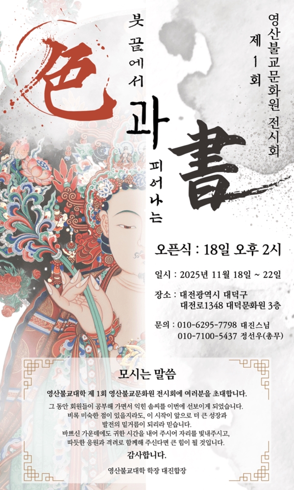 영산불교문화원(회주 남산스님, 학장 대진스님)은 오는 18일부터 22일까지 대덕문화회관에서 불화(佛畵)와 서예(書藝)를 주제로 한 불교예술 전시회를 개최한다. 이번 전시는 수행과 배움을 통해 완성된 불화와 서예 작품을 시민들과 함께 나누며, 전통의 맥을 잇는 불교예술의 현대적 가치를 조명하는 뜻깊은 자리로 마련됐다.