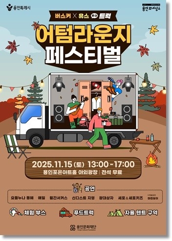 용인문화재단(이사장 이상일)은 오는 15일 오후 1시부터 5시까지 용인포은아트홀 야외광장에서 가을맞이 축제 ‘2025 어텀라운지페스티벌’을 개최한다. 이번 행사는 ‘도심 속 캠핑 감성’을 주제로, 가족 단위 관람객이 돗자리나 소형 텐트를 설치해 자유롭게 휴식과 공연을 즐길 수 있는 ‘자율 텐트존’을 마련해 도심 속에서 여유로운 가을을 만끽할 수 있도록 기획됐다.