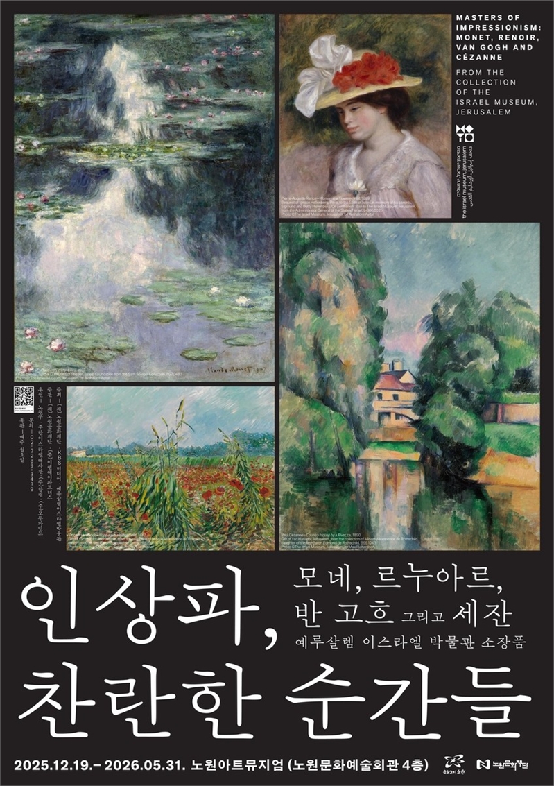 노원구(구청장 오승록)는 다음 달 19일부터 내년 5월 말까지 노원아트뮤지엄에서 ‘인상파, 찬란한 순간들 : 모네, 르누아르, 반 고흐 그리고 세잔’ 전시를 개최한다고 밝혔다. 이번 전시는 인상주의 미술의 정수를 보여주는 대규모 해외 원화 전시로, 빈센트 반 고흐, 클로드 모네, 피에르 오귀스트 르누아르, 폴 세잔, 폴 고갱, 차일드 하쌈 등 인상파 거장 11인의 대표작이 공개된다.