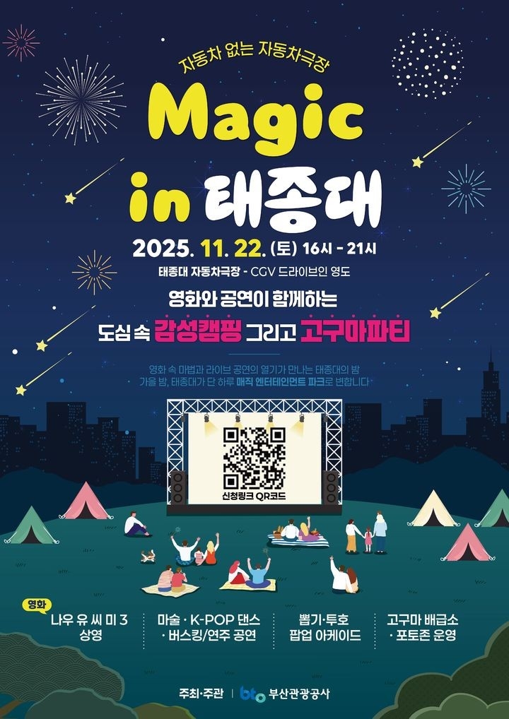 부산 태종대유원지 자동차극장에서 자동차 대신 텐트를 설치하고 영화를 관람하는 이색 행사가 열린다. 부산관광공사는 22일 오후 4시부터 9시까지 태종대유원지 내 드라이브 인 영도 CGV에서 ‘자동차 없는 자동차극장, 매직 인 태종대’ 행사를 개최한다고 14일 밝혔다. 자동차극장의 고정된 이미지를 벗어나 색다른 방식으로 태종대의 새로운 매력을 알리기 위한 취지다.