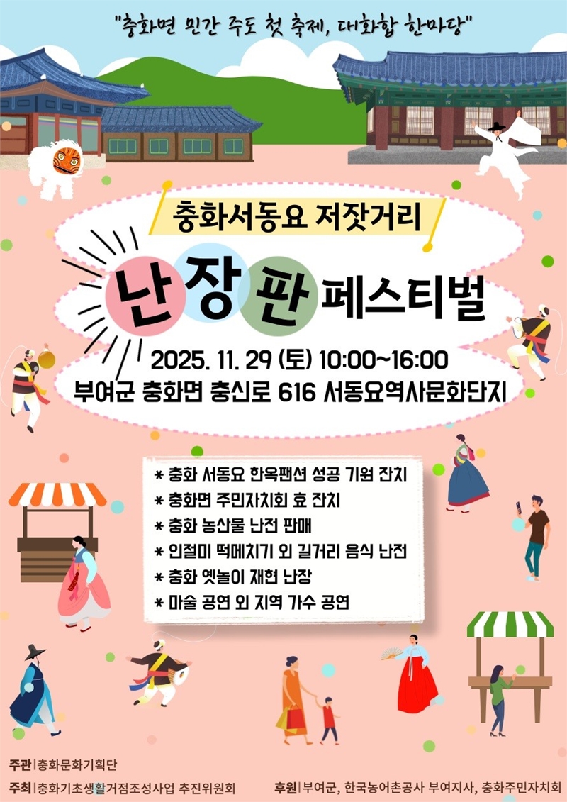 충남 부여군 충화면이 주민 주도형 첫 축제를 선보인다. 부여군은 이달 29일 충화면 서동요역사관광단지에서 ‘충화 서동요 저잣거리 난장판 페스티벌’을 개최한다고 밝혔다. 충화면은 계백 장군의 출생지이자 무술 수련지로 알려진 천등산을 품고 있지만, 군내에서 가장 인구가 적고 변두리에 위치해 상대적으로 관심에서 벗어나 있던 지역이다. 이번 축제는 이러한 인식을 넘어 새로운 도약의 계기를 만드는 취지로 추진된다.
