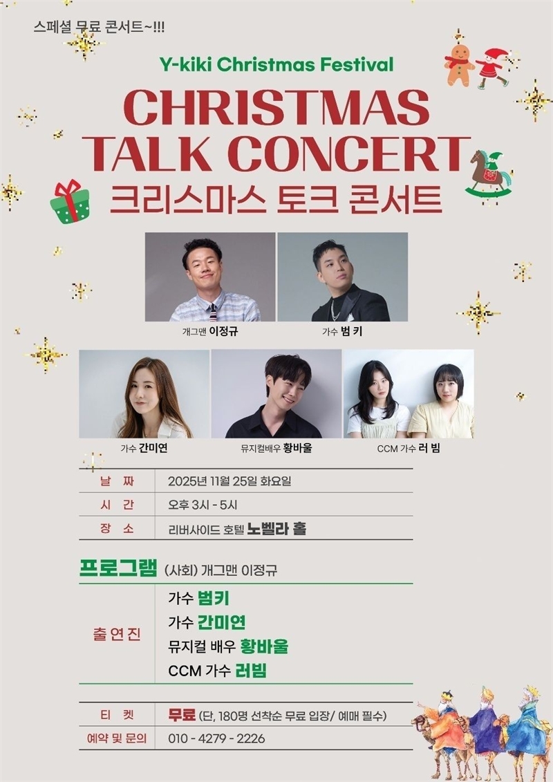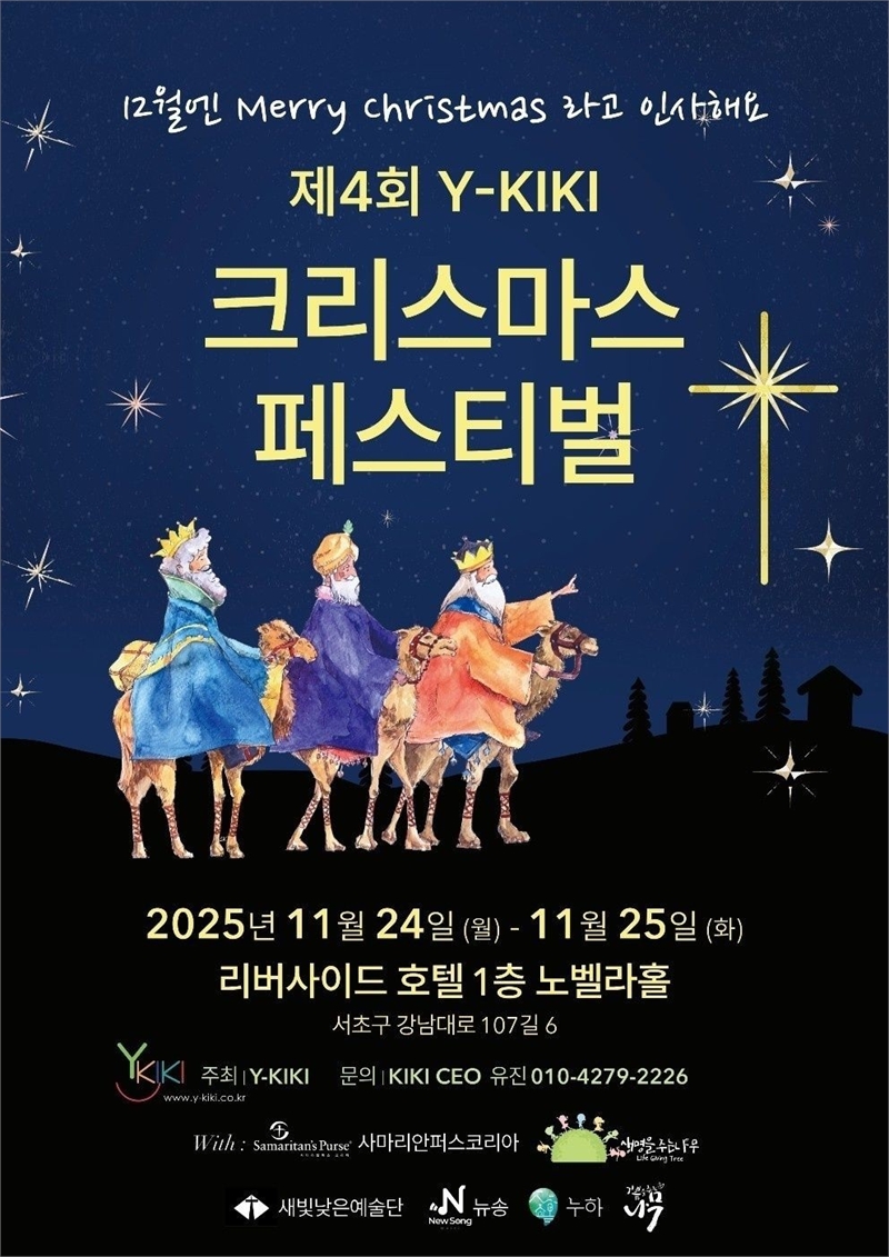 Y-kiki가 주최하는 ‘제4회 Y-kiki 크리스마스 페스티벌’이 24~25일 서울 서초구 리버사이드호텔에서 개최된다. 지역 단체, 교회, 예술가들이 함께 참여하는 행사로, 공연·예배·토크콘서트·패밀리 프로그램 등 다양한 순서가 준비돼 가족 단위 관람객의 참여가 기대된다.