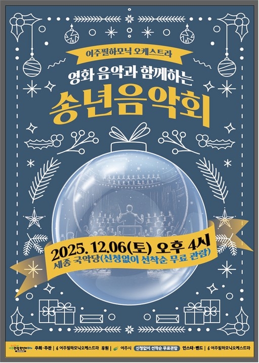 여주 필하모닉 오케스트라(대표 이정예, 단장 박영규)는 오는 12월 6일 오후 4시 세종국악당에서 ‘영화 음악과 함께하는 2025 송년음악회’를 개최한다고 밝혔다. 이번 공연은 연말을 맞아 시민들이 친숙한 영화 음악과 클래식 선율을 통해 한 해를 돌아보는 시간을 마련하고자 기획됐다.