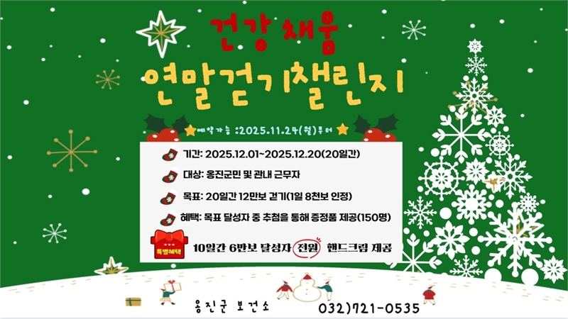 옹진군은 연말을 맞아 12월 1일부터 20일까지 20일간 운영되는 ‘건강채움, 연말걷기’ 챌린지 참가자를 24일부터 모집한다고 밝혔다. 이번 걷기 행사는 올해 마지막 걷기 캠페인으로, 군민들의 걷기 실천 분위기 확산과 연말 건강관리 동기 부여를 목표로 마련됐다.