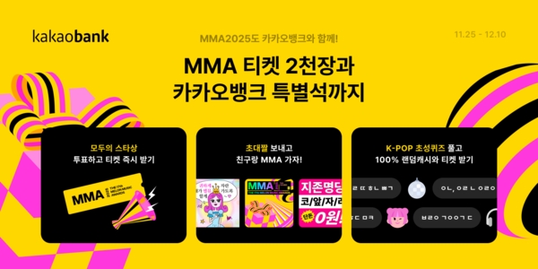 카카오뱅크가 올해도 멜론뮤직어워드(MMA) 타이틀 스폰서로 참여하며 이를 기념한 대규모 초대권 추첨 이벤트를 진행한다. 카카오뱅크는 MMA2025 타이틀 스폰서 참여를 기념해 총 2030장의 초대권을 제공하는 고객 참여형 이벤트를 25일부터 시작한다고 밝혔다.