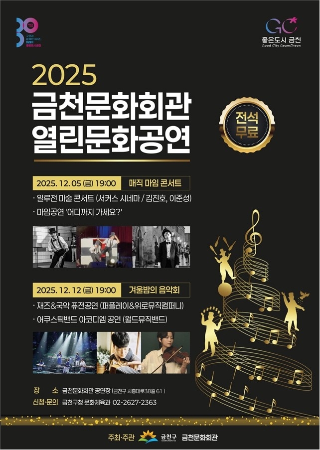 금천구는 오는 12월 5일과 12일 오후 7시, 두 차례에 걸쳐 금천문화회관에서 기획공연 ‘2025 금천문화회관 열린문화공연’을 진행한다고 밝혔다.
