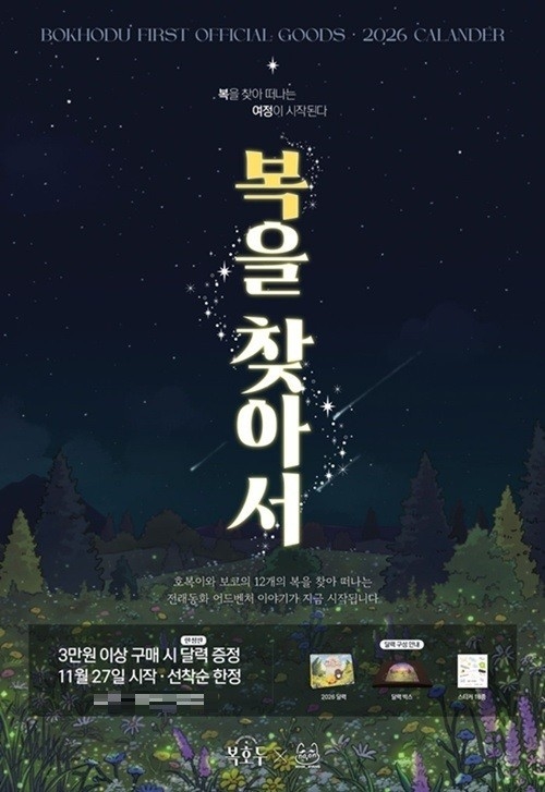 호두과자 브랜드 복호두가 브랜드 최초의 공식 굿즈인 2026년 달력 ‘복을 찾아서’를 출시했다고 밝혔다. 이번 달력은 감성 일러스트레이터 눈냥 작가와 협업한 작품으로, 복호두의 대표 캐릭터 호복이와 보코가 ‘복의 문’을 열기 위해 ‘복의 조각’을 찾아 떠나는 12개월 여정을 전래동화 어드벤처 형식으로 풀어냈다.
