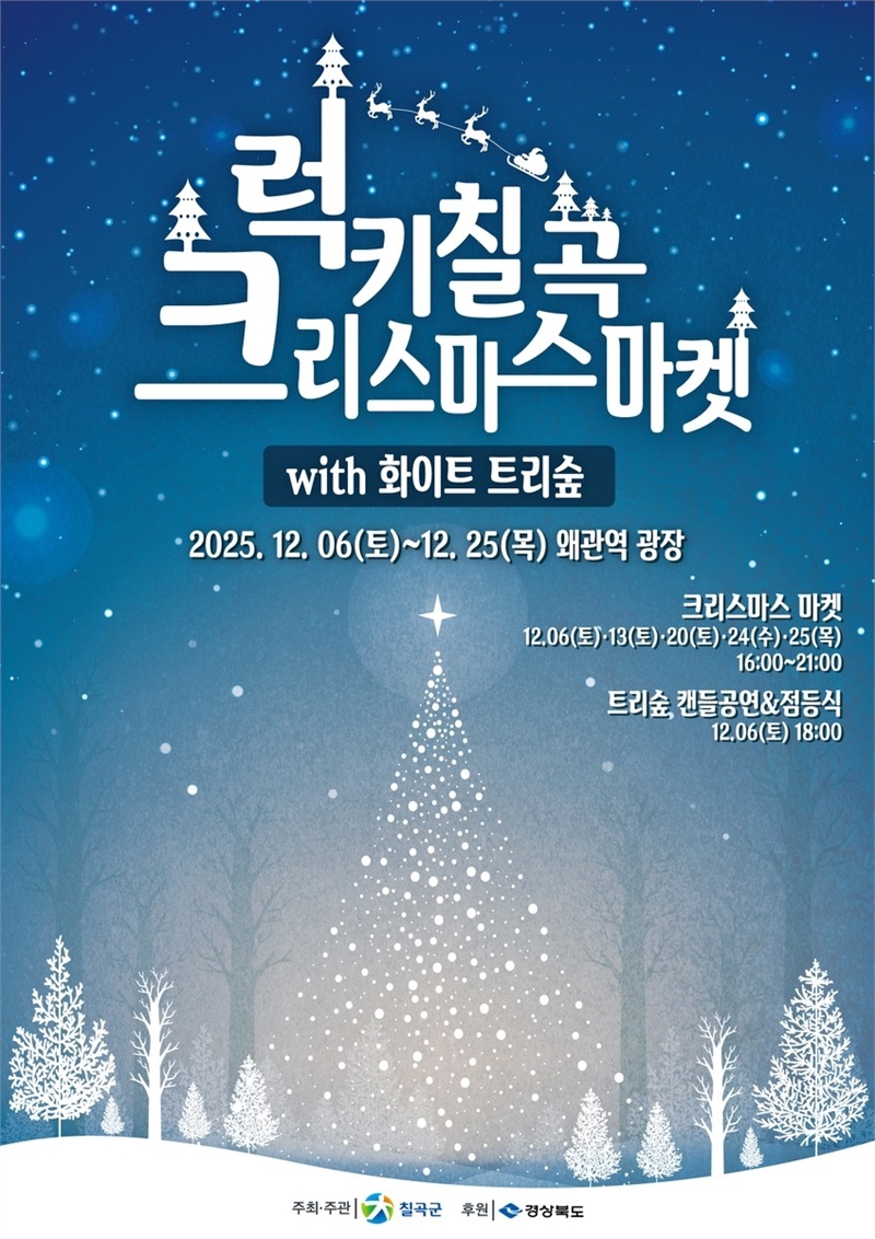 행사는 매회 오후 4~9시 진행되며, 현장에서는 다양한 크리스마스 소품과 지역 수공예품이 판매될 예정이다. 또한 지역민 성가대를 비롯한 무대 공연이 이어지고, 왜관역 주변에는 대형 트리로 구성한 ‘화이트 트리 숲’이 조성돼 겨울 분위기를 한층 더할 전망이다.