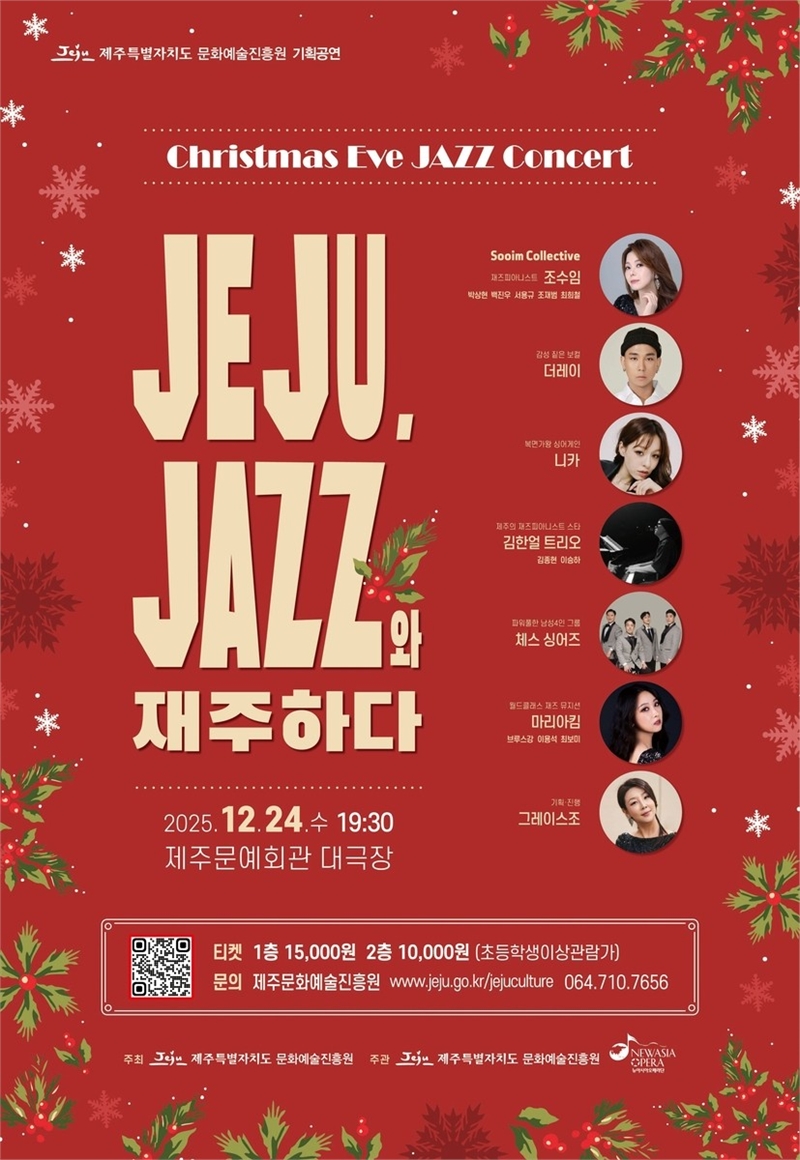 제주도문화예술진흥원은 24일 오후 7시 30분 문예회관 대극장에서 크리스마스 기획공연 ‘제주, JAZZ와 재주하다’를 개최한다고 밝혔다. 이번 공연은 크리스마스를 대표하는 음악과 재즈 스탠더드, 제주를 모티브로 한 창작곡을 한 무대에서 감상할 수 있도록 기획됐다.