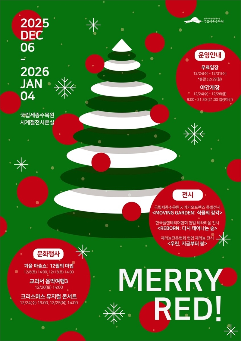 수목원은 겨울 시즌을 맞아 다양한 문화 프로그램을 마련했다. 6일과 13일에는 가족 단위 관람객을 위한 ‘겨울 마술쇼’, 20일에는 교육적 요소를 결합한 ‘교과서 음악여행’이 진행된다. 성탄절 연휴인 24일과 25일에는 ‘크리스마스 뮤지컬 콘서트’가 열려 수목원을 찾는 시민들에게 특별한 공연을 선사한다.