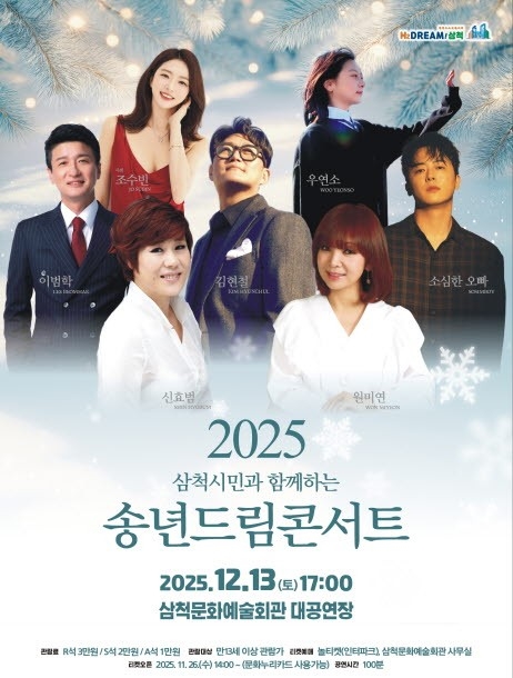 삼척시는 연말을 맞아 시민들에게 위로와 응원의 메시지를 전하고 다가오는 새해를 함께 준비하기 위해 ‘2025 삼척시민과 함께하는 송년드림콘서트’를 개최한다고 밝혔다. 공연은 13일 오후 5시 삼척 대공연장에서 열린다.