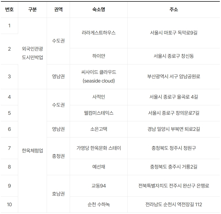 [표] 2025 한국 민박업 우수 숙소