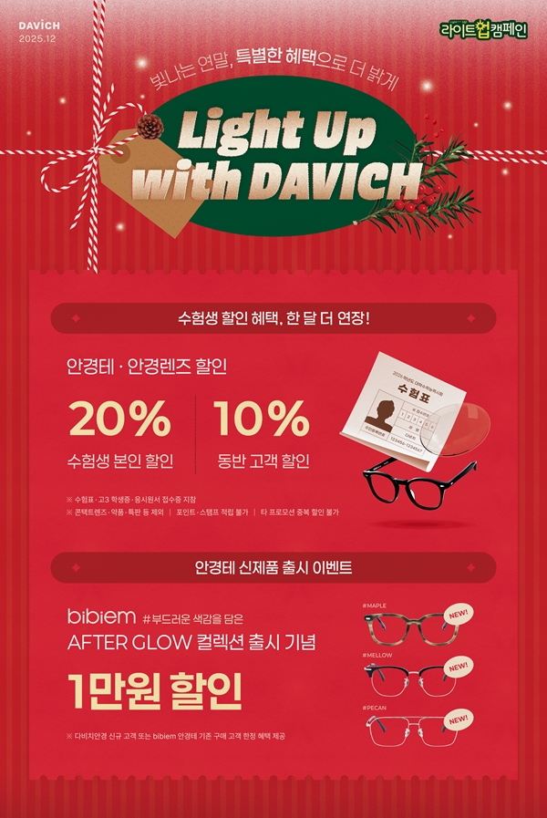 콘택트렌즈 고객을 위한 ‘다빛데이’ 프로모션도 운영된다. 12월 8일부터 21일까지 전국 다비치안경 매장에서 아큐브, 쿠퍼비전, 알콘, 바슈롬 등 주요 브랜드 콘택트렌즈를 합리적인 가격에 구매할 수 있으며, 추가 할인과 증정 혜택도 함께 제공된다. 다빛데이는 지난 9월 진행 당시 큰 호응을 얻은 바 있다.