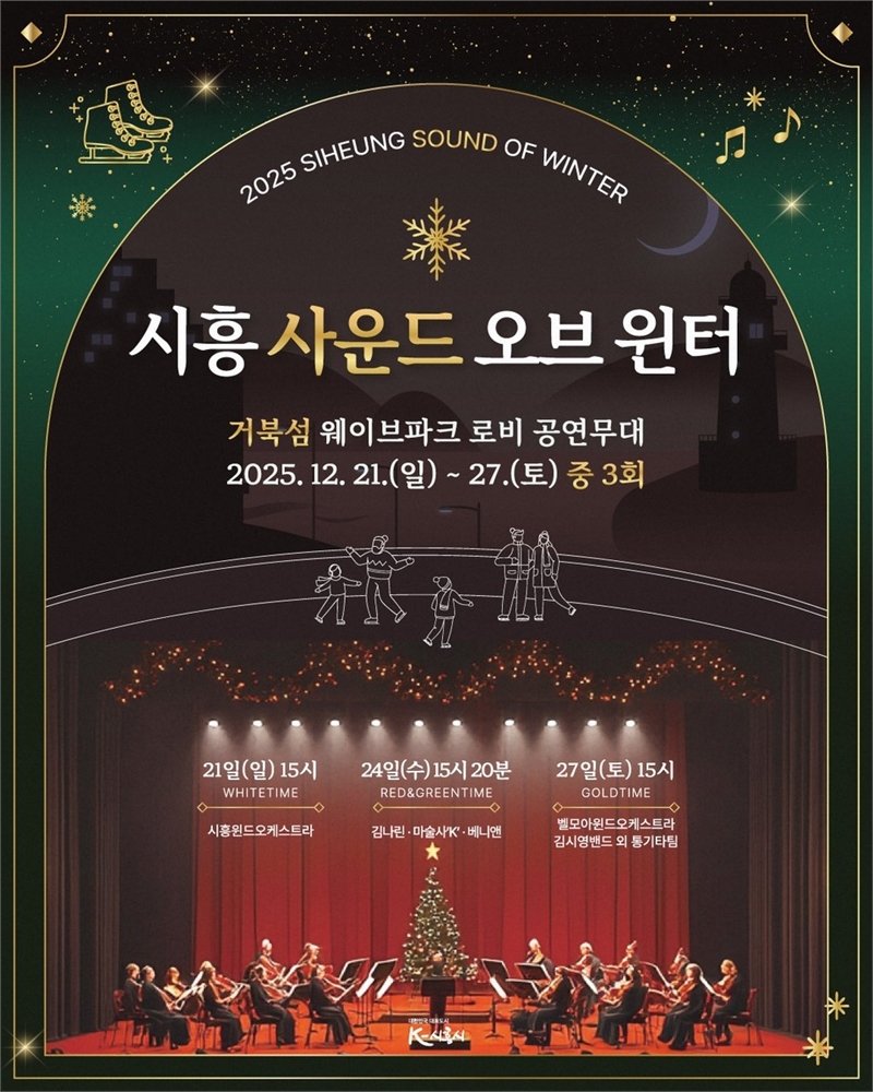 ‘2025 시흥 사운드 오브 윈터’는 12월 21일부터 27일까지 웨이브파크 로비 공연무대에서 총 3회 진행된다. 21일 오후 3시 시흥윈드오케스트라의 연주를 시작으로 성악과 재즈 보컬 무대가 이어지며, 24일에는 마술사 K, 기타 연주자 김나린, 팝페라 그룹 베니앤이 크리스마스이브 공연을 선보인다. 27일 마지막 공연에서는 벨모아윈드오케스트라와 김시영 밴드, 통기타팀이 무대에 오른다. 공연은 누구나 자유롭게 관람할 수 있다.