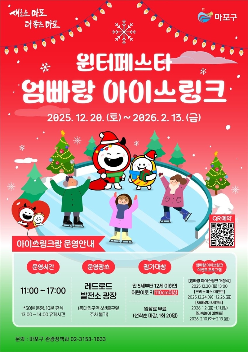 마포구는 겨울을 맞아 레드로드 발전소 광장에 가족형 겨울 체험 공간인 ‘윈터페스타 엄빠랑 아이스링크’를 조성하고 12월 20일 개장한다고 밝혔다. 이번 아이스링크는 지난여름 같은 장소에서 운영돼 큰 호응을 얻은 ‘엄빠랑 물놀이장’에 이어, 겨울방학 기간 가족들이 함께 즐길 수 있는 계절형 콘텐츠로 마련됐다.